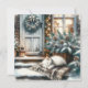 Cartão de Natal personalizado. Uma doce aquarela da arte ai ilustra um pequeno gatinho branco dormindo em um cobertor nos degraus de uma varanda dianteira para uma antiga fazenda rústica.
