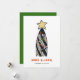 Cartão de cartões de natal corporativo com a torre Gherkin de Londres vestida como uma árvore de Natal retrógrada, completa com estrela amarela no topo. "Feriados Felizes" é escrito em uma fonte vermelha lúcida acima de seus nomes em um texto moderno e elegante. Personalize sua saudação, nome e mensagem no verso. Arte original e design por Annie Montgomery Design.