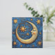 Um cartão de férias celestial bonito. A frente é uma lua de conteúdo e estrelas com um fundo azul bonito. As costas dizem: Paz na Terra. Esta é uma placa plana de dois lados.