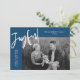 Envie alegria aos amigos e à família com um cartão de férias simplesmente alegre de Late Bloom Paperie! O cartão de feriado moderno apresenta "alegria" em um roteiro de pincel branco, escrito à mão, com um fundo azul escuro. Personalize a frente da placa adicionando sua foto, saudação personalizada, nome da família e ano. A placa reverte para exibir um padrão de faixa diagonal azul e branca do marinho.