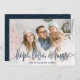 Envie amor esta temporada para sua família e amigos com esses cartões modernos estilados por Orabella Impressões. A camada de texto elegante diz, "esperança, amor e abraços" em azul marinho sobre uma camada branca de gradiente na parte inferior da placa. A parte traseira apresenta pequenos pontos brancos de neve sobre um fundo azul marinho, que pode ser personalizado para qualquer cor que você quiser.