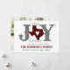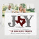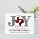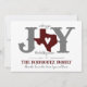 Desejar alegria para amigos e família do tamanho do Texas nesta temporada de férias é fácil com este design. O "O" de alegria é substituído pela forma do Texas com um coração cortado do centro. Letra no estilo ocidental em conjunto com texto escrito à mão. Personalize a frente com seus nomes familiares e as costas com sua foto favorita. Design permite que você escolha suas próprias cores. Vem em vermelho, verde, azul, lavanda, aqua, marrom, laranja queimado, ouro e prata. Produtos correspondentes disponíveis.