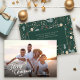 Este simples cartão de Natal de foto de cheio apresenta um elegante roteiro moderno e espaço no verso para uma mensagem pessoal. A parte de trás oferece um padrão verde boho de inverno que aparece em bronzeados suaves e chaleiras em um fundo verde-escuro.