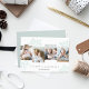 O único design de cartão de feriado moderno apresenta quatro fotos favoritas dispostas lado a lado com silhuetas de floco de neve verde de menta pastel de tamanho excessivo no fundo. Personalize com o seu cartões de natal personalizado e o(s) seu(s) nome(s) familiar(s) abaixo em caracteres clássicos; mostrados com "Saudações da Estação".