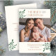 Um belo e novo cartão de cartões de natal de natal. Este design moderno e jovem apresenta um conjunto de fontes contemporâneas, uma foto e um texto personalizável na frente e no verso da placa. Os fundos, tanto na frente como no verso, são brancos, com acentos de novo verde jovem. Personalize e personalize para torná-lo seu próprio.