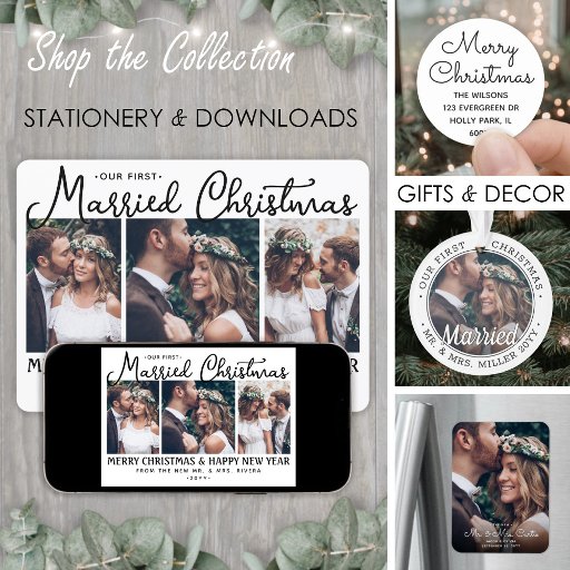 Enviar desejos de feriado alegres como novo Sr. & Sra.! Celebre seu primeiro Natal casado e compartilhe quatro de suas fotos favoritas de casamento com um cartão de feriado de na moda personalizado "Merrily Ever After". Todo o texto desta modelo é simples de personalizar para incluir qualquer texto, como Feliz e Casado, Casado Merrily, Feriados Felizes, Saudações de Sábados, Cheers de Ano Novo, etc. Modifique ou exclua a mensagem na parte traseira para usar como obrigado de casamento que você e o cartão de Natal combinaram. (DICA DE IMAGEM: Uma maneira fácil de centralizar uma imagem exatamente como você deseja é recortá-la antes de carregá-la no site do Zazzle.) O moderno minimalista design preto e branco apresenta uma camada de tipografia de script manuscrita moderna e uma grade de fotos única com 4 imagens de sua escolha. A família e os amigos adorarão mostrar esta elegante carta personalizada. Saúde aos recém-casados!