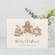 This Christmas card features watercolor cookies, gold festive greenery, and stylish script typography on a cream background.
