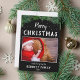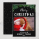 Merry Christmas Script Pine Preto e Branco Floco de Neve Foto Cartão de Natal. Cartão de Natal festivo com Felicidades, seu desejo, nome da família e o ano em uma fonte branca moderna - personalize com seu texto. O fundo é preto com flocos de neve brancos e folhas de pinheiro verdes. Insira sua foto favorita da família no modelo e faça um cartão de Natal especial para sua família e amigos.