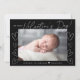 Placa de Dia de os namorados moderna com "Meu Primeiro Dia de os namorados!" em um roteiro branco com corações desenhados à mão ao longo das laterais da placa em um fundo preto. Sua foto horizontal é exibida perto do meio do design. Personalize o cartão de Dia de os namorados preto e branco, acrescentando o seu nome e o ano em caracteres brancos. A carta se inverte para exibir um padrão de corações negros.