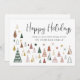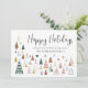Mínimo divertido cartão de Natal moderno, com ilustrações retrô-abstrato das árvores e estrelas verdes, terractas e douradas, "Felizes Feriados" em um roteiro de na moda e sua saudação e nome em uma simples tipografia.