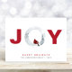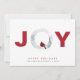 Um cartão de saudação de Natal minimamente moderno, inspirado na natureza, com a palavra "JOY" em letras grandes de blocos vermelhos, com o "O" representado por uma ilustração de cor d'água dos pinheiros de neve e um dentro cardeal vermelho. Você pode personalizar a saudação "Feliz Feriados" na coordenação da simples tipografia vermelha e do seu nome e ano abaixo.