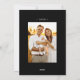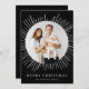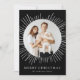 Na moda e cartão de feriado moderno com a sua dentro de foto aninhada de um quadro circular branco de explosão solar. Personalize o cartão de natal sunst com o seu nome familiar em letras brancas num fundo preto ou numa cor da sua escolha. A parte traseira do cartão exibe o ano e uma foto adicional.