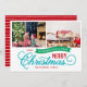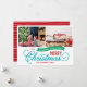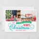 Barato Cartões de foto de Natal impressos personalizados com um modelo DIY simples para personalização. Este design de diversão apresenta tipografia quística em turquesa, verde e vermelho. A mensagem dizia "Desejar-te um Natal Muito Feliz". O modelo tem espaço para duas fotos da família. Use as ferramentas de design para editar as fontes e as cores. O lado inverso tem um padrão de distribuição de coordenação ou usa o espaço para adicionar mais fotos e texto.