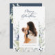 Cartão botânico de inverno, multifoto. Feliz Natal em roteiro azul. Características do cartão, elegantes quadros de aquarelas de inverno, algodão, folhas e carapaça com cobertura azul de inverno. Foto do solteiro na frente e duas fotos na parte traseira.