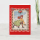 Nesta imagem de vintage, duas crianças pequenas patinam no gelo em um lago. O menino está segurando as duas mãos da garota e a guiando no gelo. A cena é moldada de uma forma típica e antiquada com múltiplas camadas de espaço de papel. uma borda de flores, e duas cores de papel que foram cortadas com uma borda recortada.