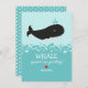 Cartão de dia de os namorados para crianças na sala de aula com um oceano azul feito de corações amorosos, uma baleia marinha fofa, o ditado "baleia é tão bonito", e o nome das crianças.