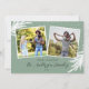 Este cartão de Natal com duas fotos é acentuado com galhos verdes em branco. O fundo verde apresenta neve branca caindo.