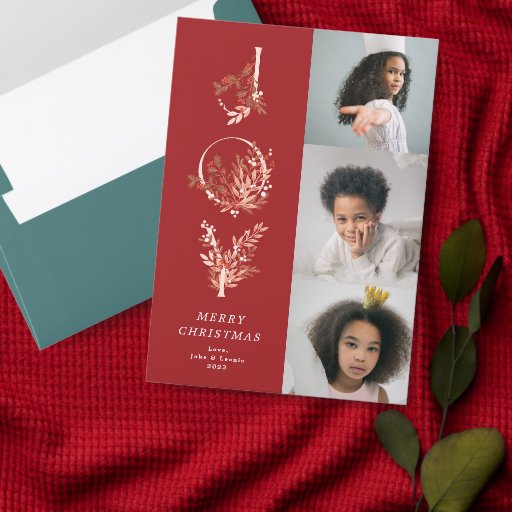 Cartão De Festividades Natal Clássico Vermelho Leafy Bold JOY Foto