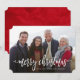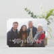 Cartão de férias moderno, com a frase "Feliz Natal", em um roteiro branco, escrito à mão. Sua foto é exibida atrás. O dorso está vermelho em apuros, mas pode ser mudado se desejado. Simplesmente exclua a camada vermelha e selecione uma cor na paleta ou use seu próprio código hexadecimal.