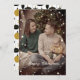 Crie o seu próprio cartão de Natal com fotos antigas, com uma foto com uma camada de estrelas e neve caindo. Padrão de vintagem preto e dourado nas costas. Personalize facilmente este único cartão fotográfico de Natal com a sua imagem e um nome de família. A aparência de vintage será adicionada automaticamente à sua foto.