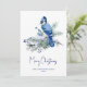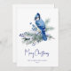 Este cartão de Natal personalizado apresenta um jay azul-aquarela empoleirado em toscas de pínus cobertas de neve com espirros de bagas azuis.