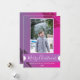 Um cartão plano de fotos de Natal roxo com texto personalizável. A foto é uma modelo destinada a trocar por sua. <i>Fotografia © Storytree Studios, Stanford, CA</i>