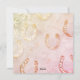 Um bonito cartão de Natal com ilustração de uma menina de cavalo branco, em estilo aquoso. A menina e o cavalo são fotografados em um pórtico, em um campo de inverno nevado com pôr do sol vermelho e amarelo. A saudação de "Feliz Natal" está no topo na tipografia da escrita de pincel. O verso da placa exibe um padrão informal de ferraduras e flocos de neve, com cores de pôr do sol. Um cartão na moda para amantes de cavalos e pôneis na época de férias.