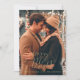 Placas de cartões de natal para os recém-casados em um design de fotos "Feliz e Brilho" dourado. Personalize com sua foto, saudação e nomes. Para obter melhores resultados, use uma foto vertical. Este cartão de feriado se reverte para uma faixa diagonal vermelha, branca e dourada no verso.