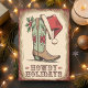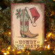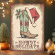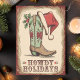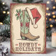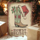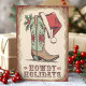 Mande cartões de natal festivos com um talento ocidental! Este cartão de Natal apresenta uma engraçada bota de cowboy adornada com o Holly e um chapéu de Papai Noel, reunindo estilo rústico e animação sazonal. Perfeito para qualquer um que ama vibes country, este cartão "Holidays Howdy" é uma maneira divertida de espalhar alegria para a família e amigos com um toque de espírito ocidental. Ideal para fãs de vaqueiro e vaqueira ou qualquer um que comemore o Natal com uma reviravolta única, em casa!