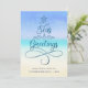 Este cartão de feriado sobre o tema da praia apresenta a tipografia costeira com a frase "Seas & Saudações" na forma de uma árvore de Natal, com um fundo de praia em abstrato. No verso estão 3 fotos.