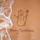 Ilustração de Natal ensolarada com um boneco de neve e Feliz Natal escrito na areia na praia ao lado do oceano.