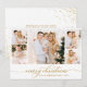 Simples Cartões de Natal de Colagem de Fotos com Script Elegante Moderno 5. Este cartão de natal multifoto minimalista e festivo apresenta cinco (5) imagens bonito de colagem em quadrinhos, um confete com brilho dourado, um texto de saudação de "Feliz Natal" que é escrito em letras de mão, caligrafia ou tipografia, tipo de letra de coroa do swash em ouro e branco. No lado inverso, os cantos de configuração de brilho e a mensagem pré-feita. Bonito cartão de boas-vindas para sua família e amigos na temporada de festas de inverno.