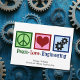 Um cartão de feriado de engenheiro legal com um sinal de paz, coração e engrenagens. Cartões de Natal bonitos para uma empresa de engenharia. Engenharia do Amor pela Paz.