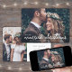 Enviar desejos de feriado alegres como novo Sr. & Sra.! Comemore o casamento como recém-casados e compartilhe duas das suas fotos favoritas de casamento com um cartão de feriado "Nosso Primeiro Natal Casado", personalizado na na moda. Todo o texto desta modelo é simples de personalizar para incluir qualquer texto, como Feliz e Casado, Casado Merrily, Feriados Felizes, Saudações de Sábados, Cheers de Ano Novo, etc. Modifique ou exclua a mensagem na parte traseira para usar como obrigado de casamento que você e o cartão de Natal combinaram. (DICA DE IMAGEM: Uma maneira fácil de centralizar uma imagem exatamente como você deseja é recortá-la antes de carregá-la no site do Zazzle.) O moderno minimalista design preto e branco apresenta uma camada de tipografia de estilo manuscrito moderna e duas fotos de sua escolha. A família e os amigos adorarão mostrar esta elegante carta personalizada. Alegra-te a merrivelmente para sempre!