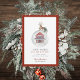 Nova casa para o cartão de anúncio de feriados com uma ilustração de aquarela de um Enfeites de natal com uma dentro de casa vermelha.