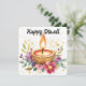 Cartão de Feriado Diwali com Oferta Luminosa Um diya radiante embalado em filigrana de ouro, cercado por um floral festivo — pétalas de rosa, creme e dança violeta com fezes de ouro comemorativo. Esta imagem evoca a alma de Diwali: reverência, renovação e a silenciosa majestade da luz sobre a sombra. A citação que a acompanha, impressa no verso, oferece uma reflexão poética para carregar o espírito do festival.