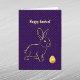 Um esboço de coelho de ouro elegante com ovo de ouro sobre fundo roxo e ouro.