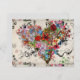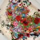 Uma colagem vibrante em forma de coração explode com desenhos florais intrincados e padrões giratórios. A obra de arte apresenta uma mistura de flores coloridas, formas abstratas e rabiscos divertidos, criando uma composição animada e dinâmica.