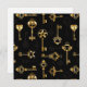 Padrão perfeito de chaves antigas, douradas e silhuetas em fundo preto.