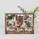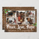Cartão de Natal de Natal com tema country com fundo de madeira rústico, um modelo de 5 imagens de colagem para você personalizar, sagrado festivo, um chá de neve, as palavras "paz, amor, esperança" em um tipo de caligrafia e suas estações saudações por baixo.