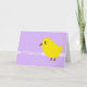 Pintinho amarelo sobre um fundo de lavanda com listras brancas e Felz pascoa.