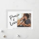 Esses cartões de Natal preto e branco simples e modernos apresentam sua foto pessoal, com tipografia casual que diz "Paz e Amor". Uma moldura cinza suave acentua sua foto e colore o verso do cartão.