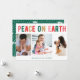 Um lindo cartão de Natal de três fotos da sua família. Espalhe a mensagem da Paz na Terra com esta design moderna e colorida. Personalize com três de suas fotos favoritas do ano, sua saudação e seu nome de família. Este cartão de Natal reverte para um padrão verde e branco de árvore de Natal no verso.