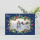 Paz na Terra com este belo cartão azul de feriado com uma coroa verde colorido e coroa com ornamentos vermelhos brilhantes e estrelas de ouro quico. Este bonito cartão de Natal ilustra alegria e felicidade com a sua fotografia personalizada no centro.