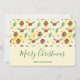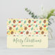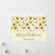 Um cartão de feriado de estilo plano com um padrão fofo com cones de pinheiro e holly sobre um fundo de aquarela amarela com pequenos círculos brancos espalhados por aí.