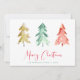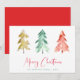 Um cartão de férias moderno mínimo com aquarelas abstrato de pinheiros em ouro, vermelho e verde, "Feliz Natal" escrito em um bonito roteiro vermelho e seu nome de família e ano em um texto simples de coordenação verde.
