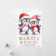 Cartões de Natal não-fotográficos personalizados pelo na moda crio com um casal bonito de pinguins de patinação no gelo em roupa vermelho. Os pinguins alegres e as saudações de Feliz e Brilho em letras coloridas estão no lado da frente. Na parte de trás, há um ano de cheio num relance de domingo a sábado de 2026. Use o modelo para personalizar com suas saudações, nome da família e ano.