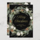 Este espantoso cartão de feriado escuro apresenta uma coroa de Natal com uma elegante folhagem botânica verde, e cones de pinheiro com flores brancas festivas sobre fundo preto. A caligrafia moderna do roteiro do ouro diz "Feliz Natal". A parte traseira tem um design correspondente com sala para adicionar uma mensagem pessoal.
