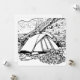 Uma placa com uma página de colorir temática de acampamento com uma cena com uma tenda em frente às montanhas de um lado e o outro lado é apenas vazio. Mande a um amigo ou cor você mesmo!