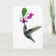 Este cartão apresenta uma imagem de um beija-flor colorido que se alimenta de uma flor.